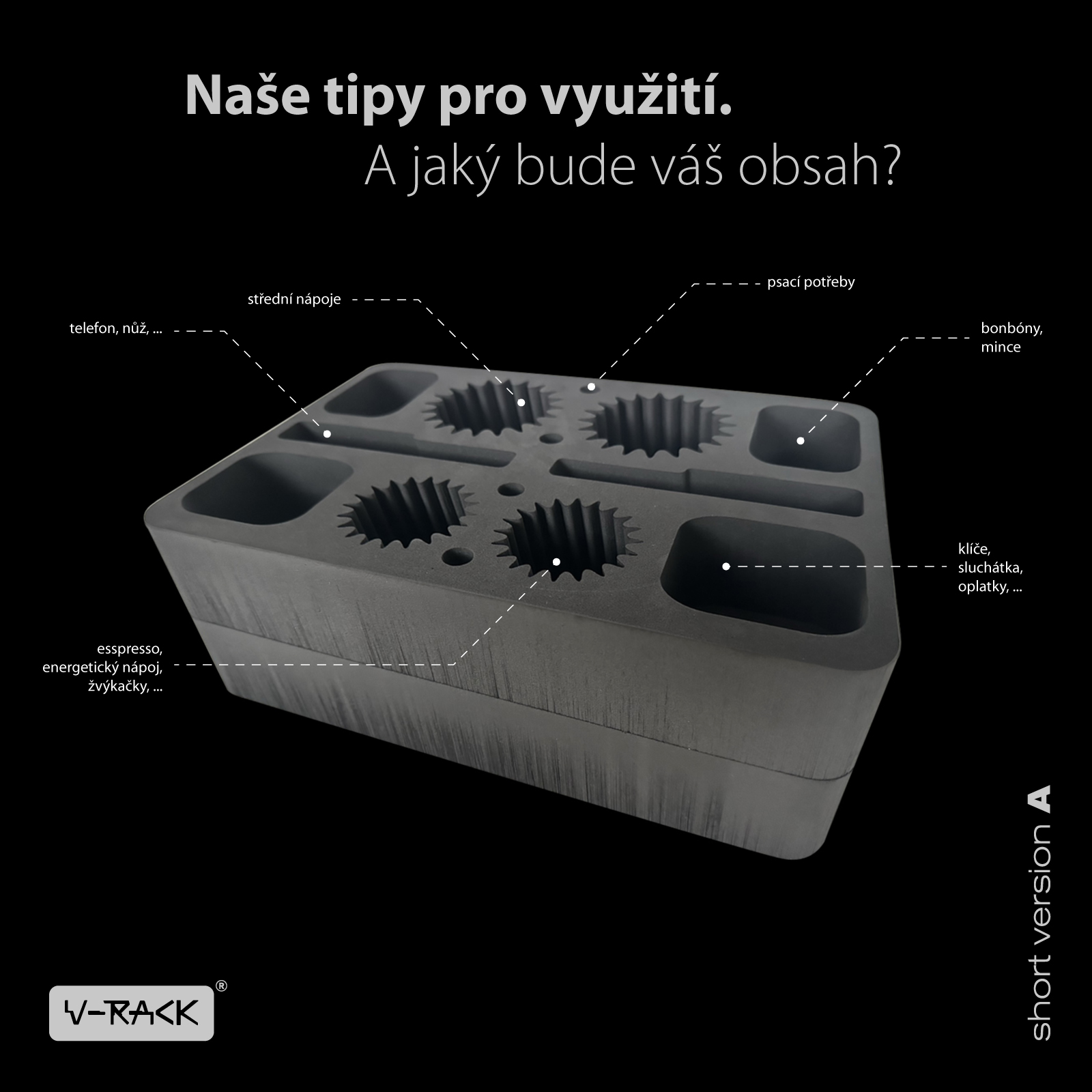 Pohodlně se usaďte a mějte díky produktu V-rack SHORT vše po ruce. Odložte si s klidem kelímek s nápojem, telefon, obal na brýle, oblíbené chuťovky, psací potřeby, zkrátka cokoliv vás napadne. Limitem jsou pouze rozměry jednotlivých sektorů. Produkt byl navržen pro jednoduchou instalaci. V-rack SHORT stačí jednoduše zasunout mezi sedadla a je hotovo. Díky PE pěně, která je lehce poddajná, se organizér jednoduše stane neodmyslytelnou součástí vašeho Véčka.